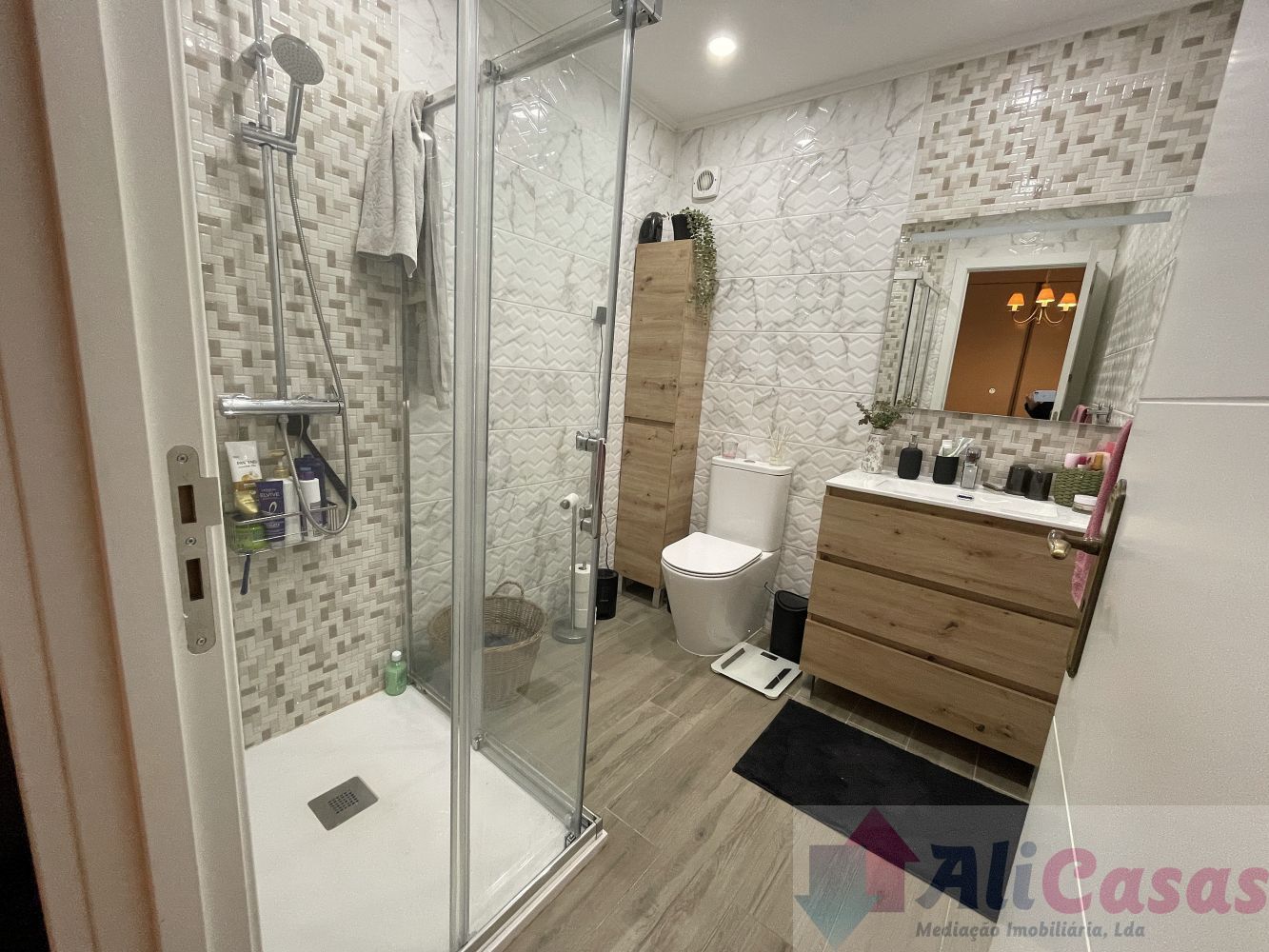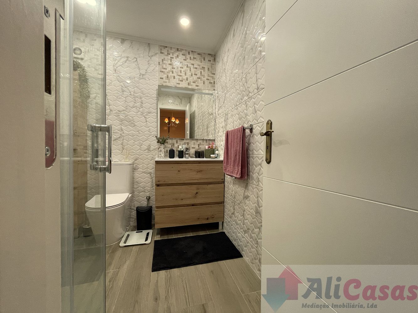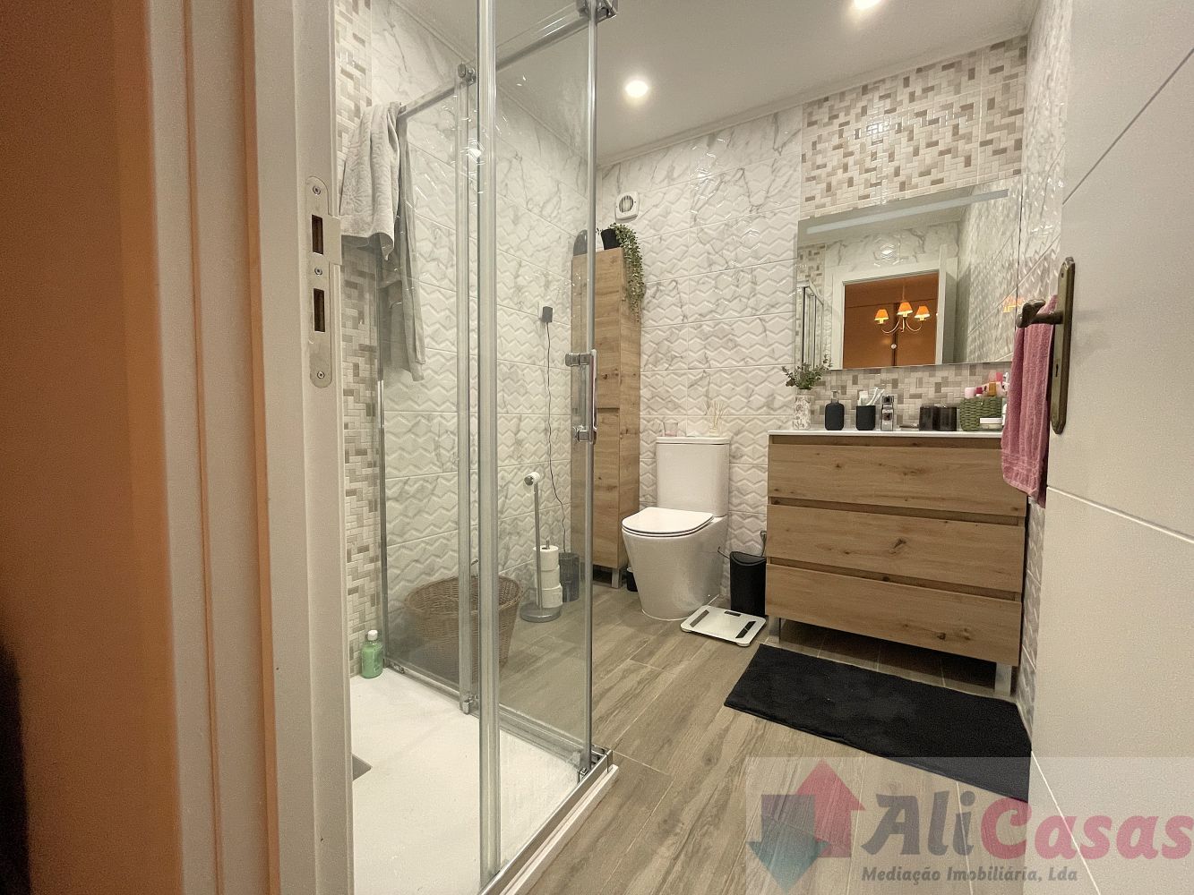 Despensa, banho completo com duche, 2 quartos interiores com roupeiros embutidos, sendo um deles uma suite com banho privativo com duche. Os banhos e quartos estão totalmente remodelados.
